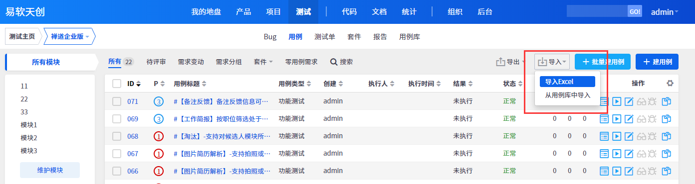 导入excel是专业版功能,可以导入“需求”、“任务”、“Bug”、“用例”,对他们添加或修改。