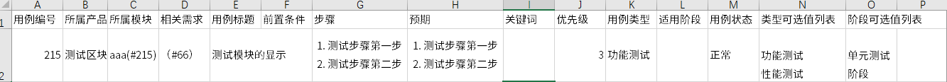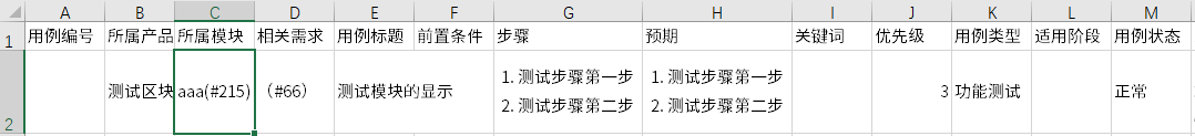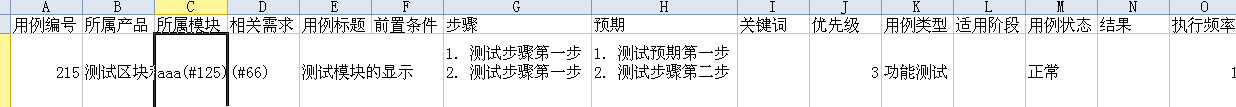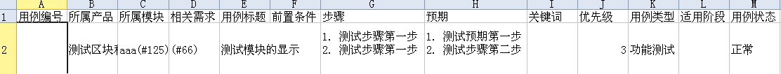 3、导入的内容包括:用例标题、所属模块、相关需求、优先级、用例类型、执行频率、适用阶段、前置条件、步骤、预期。