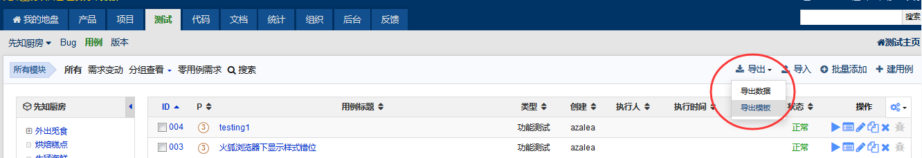 2、测试→用例→导出→导出数据,导出已有数据的csv文件。在此文件进行修改或新增数据,保存。