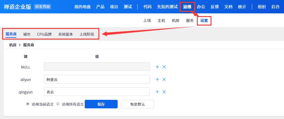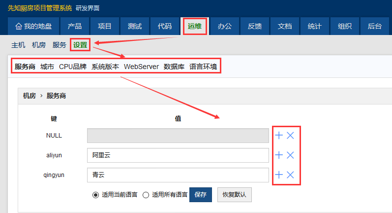 可自定义添加服务商、城市、CPU品牌、系统版本、WebServer、数据库、语言环境、上线阶段。
