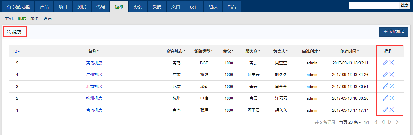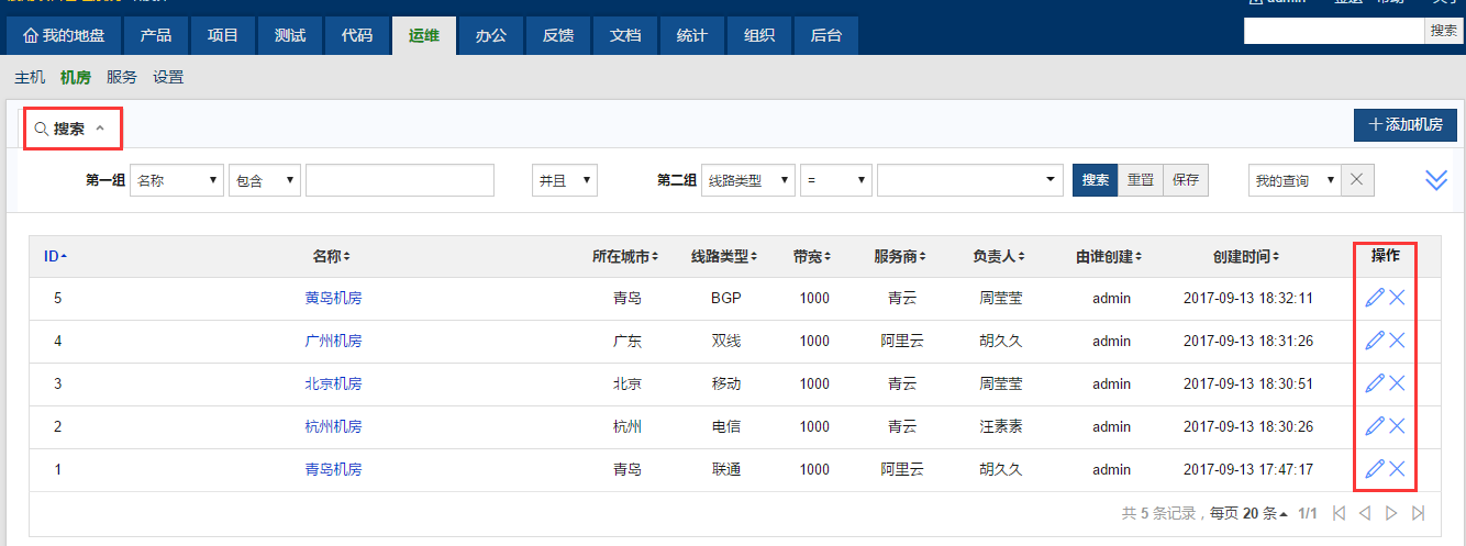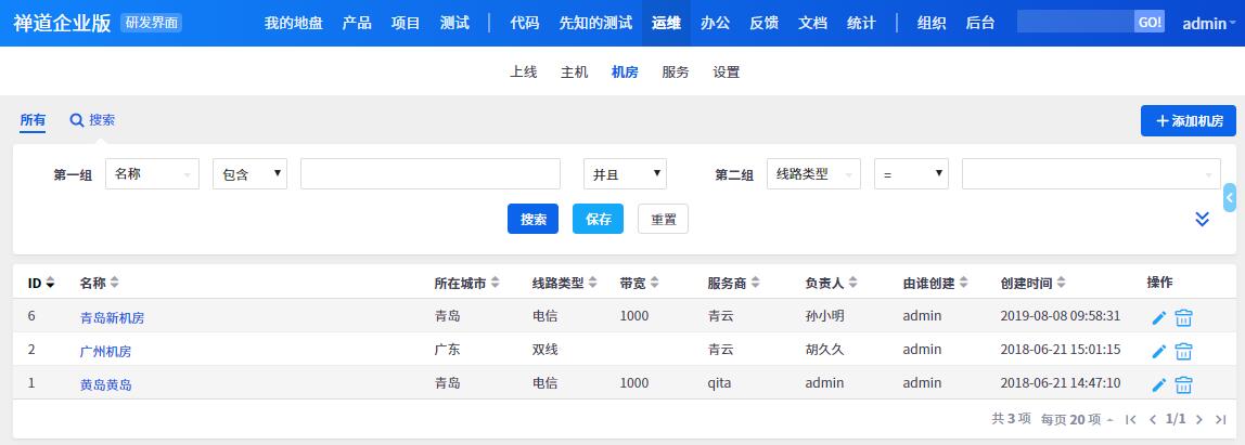 添加成功的机房可以在机房页面查看,也可以通过条件搜索机房。