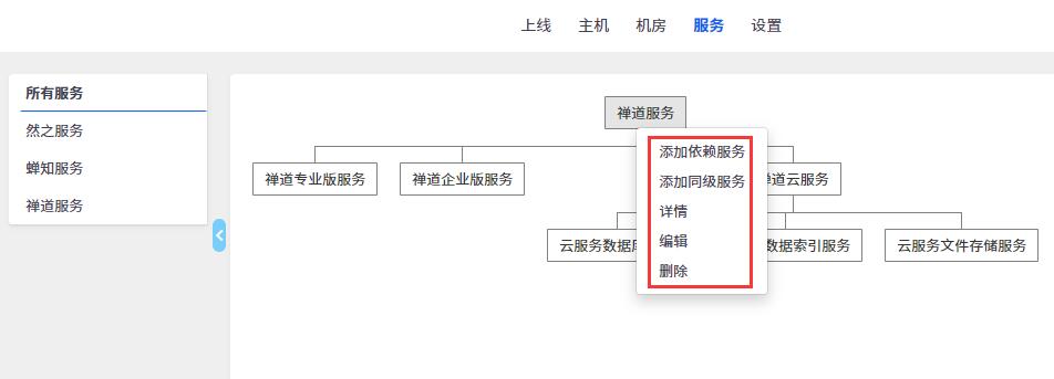 在已添加的服务上,鼠标右键点击,即可添加依赖服务、同级服务。还可以查看已添加的服务的详情,对已添加服务进行编辑和删除操作。