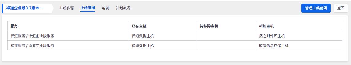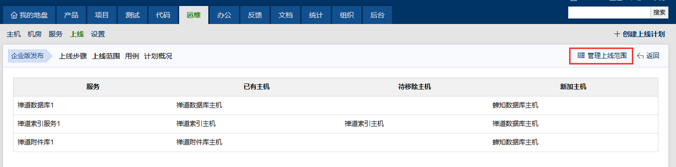 点击右上角的管理上线范围,可以编辑本次上线影响到的主机和服务。