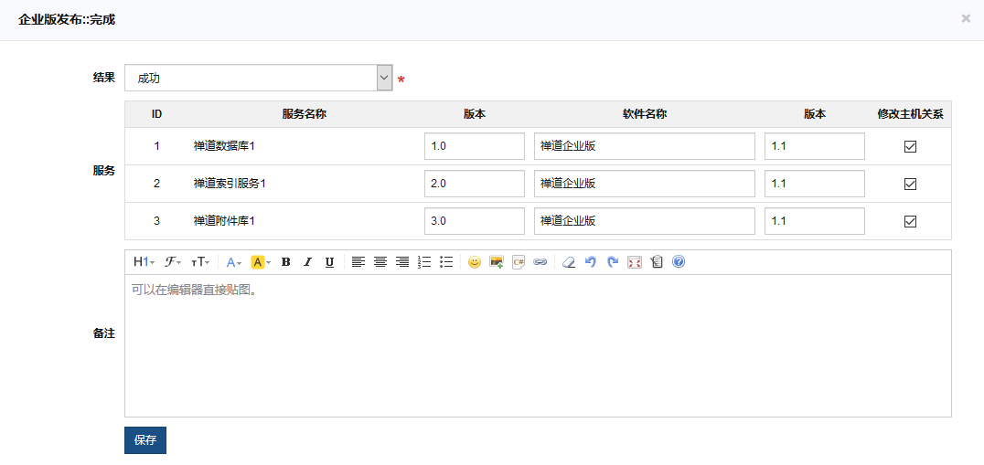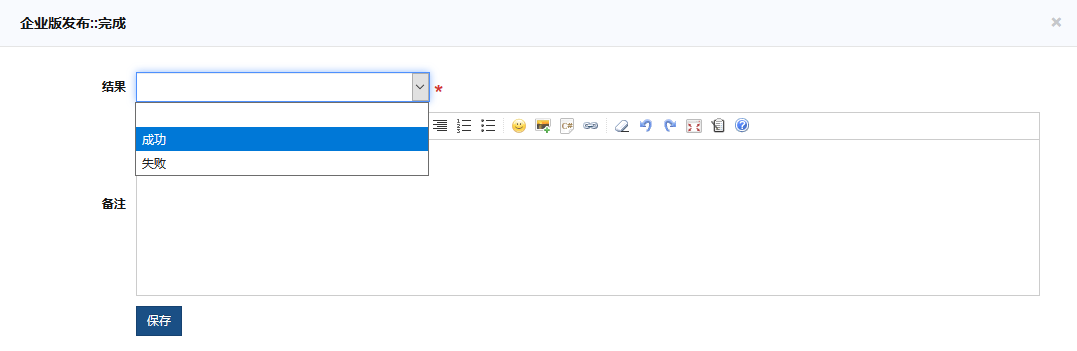 上线按步骤进行到最后,点击完成时,结果可以选择为成功和失败。