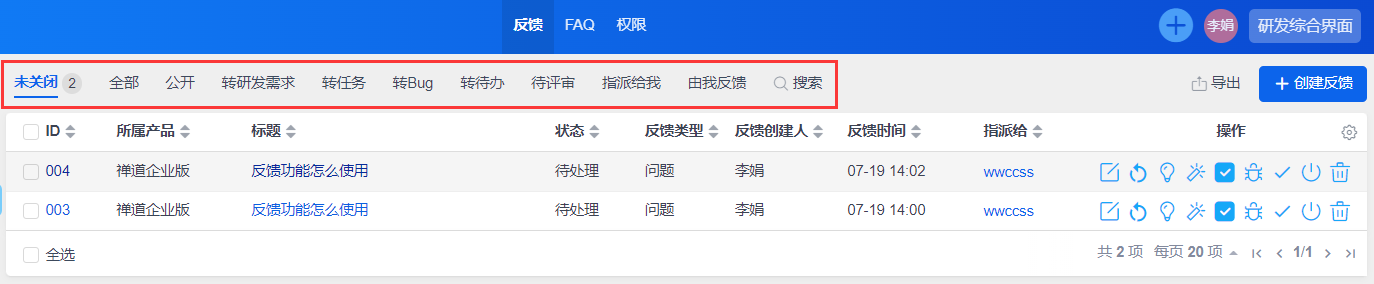研发用户登录,可以在反馈管理模块里查看到提交的反馈。