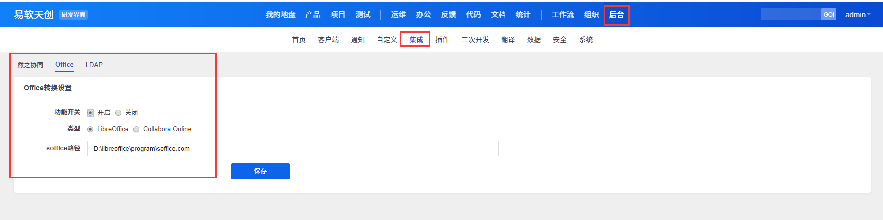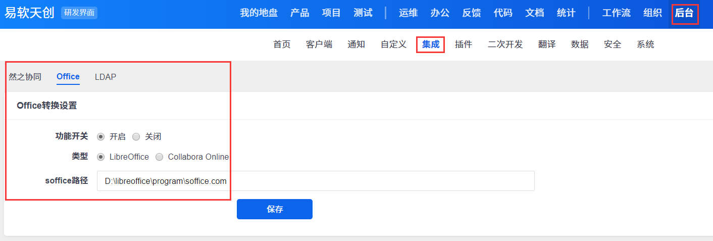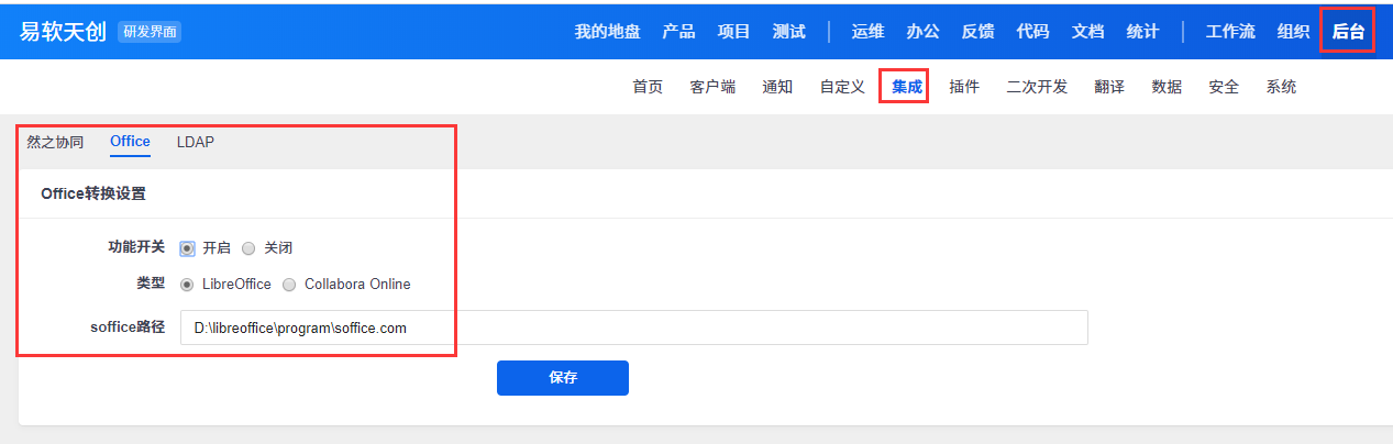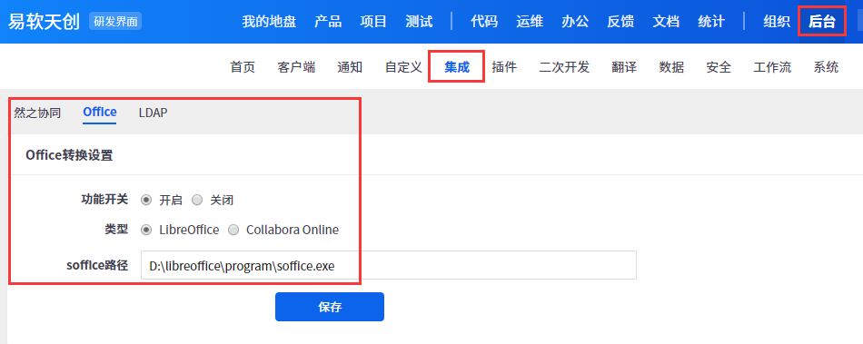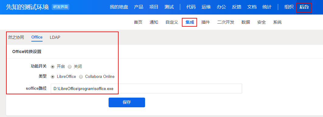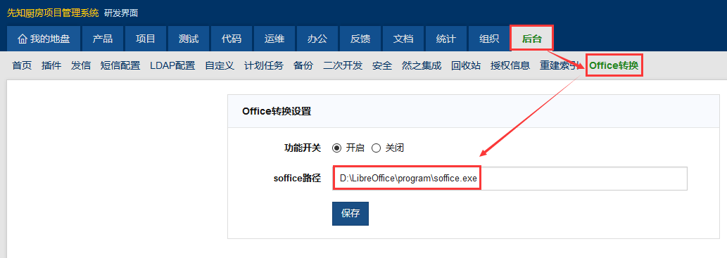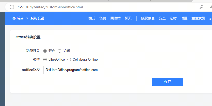 安装好LibreOffice之后在禅道后台里开启office转换,并且填写 LibreOffice 的转换程序路径。