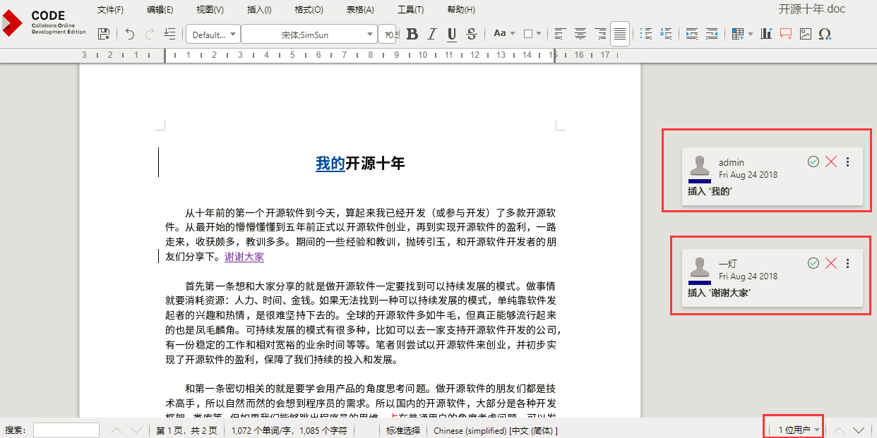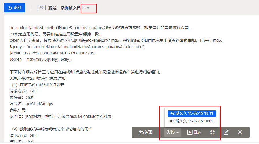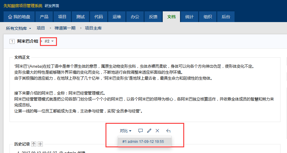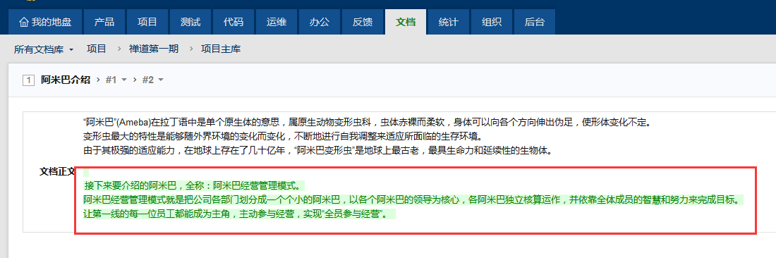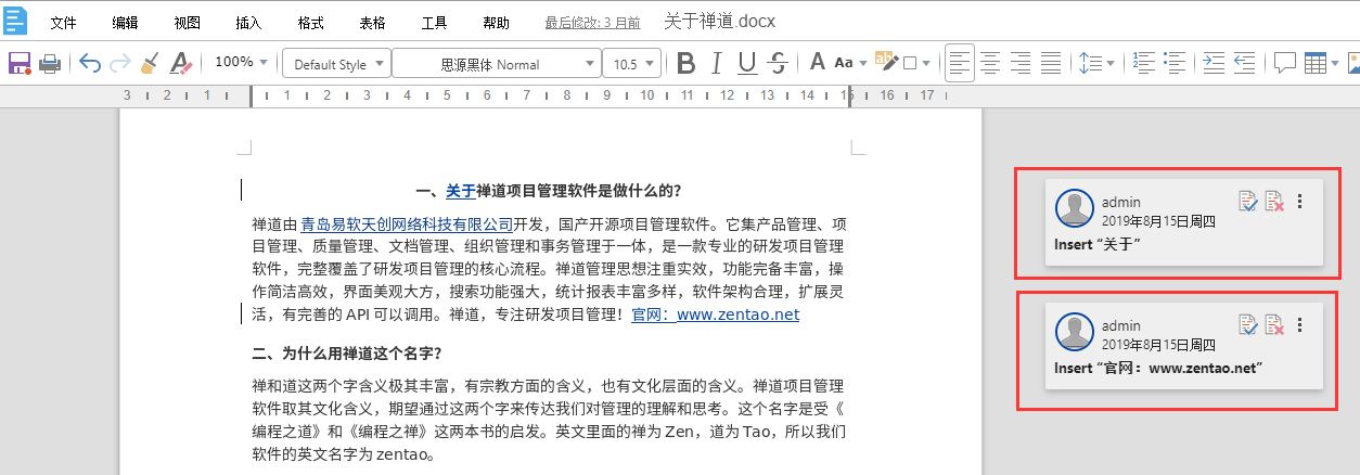 编辑文档后,右侧会标注出禅道不同用户的修改记录。