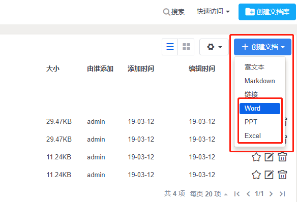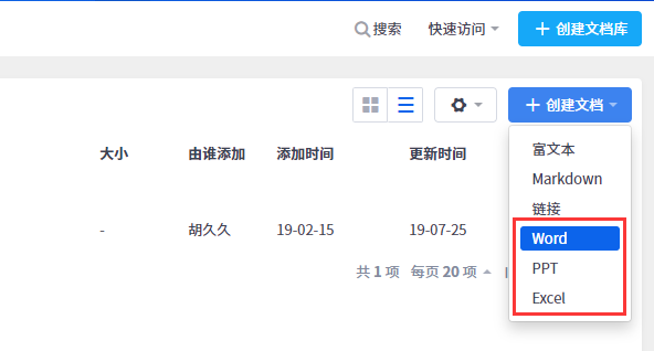 点击进入文档库后,右上角的创建文档的下拉菜单里,有创建Word、PPT、Excel格式的入口。