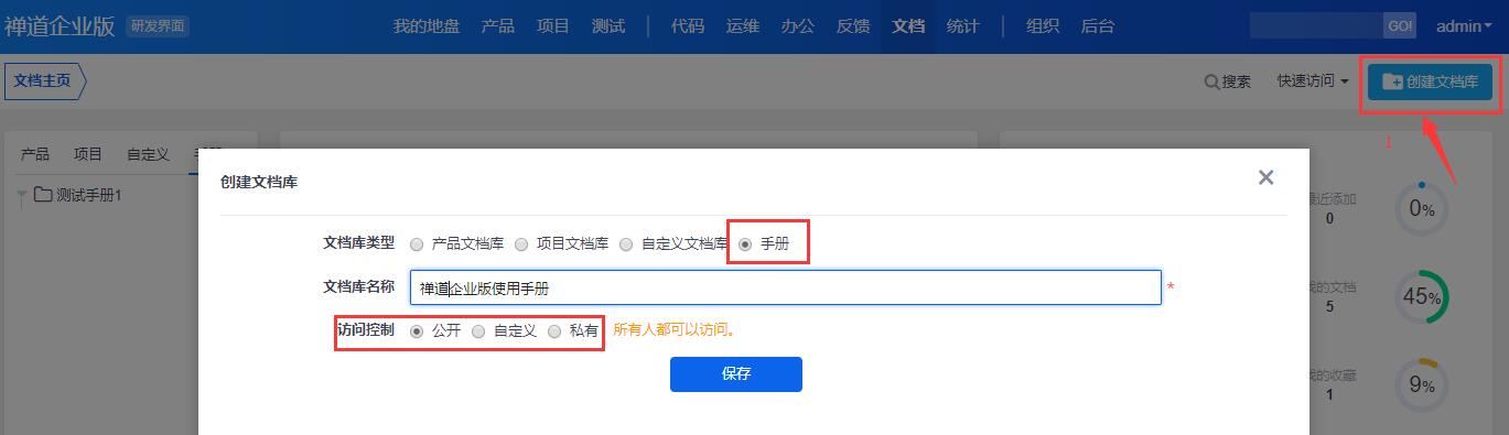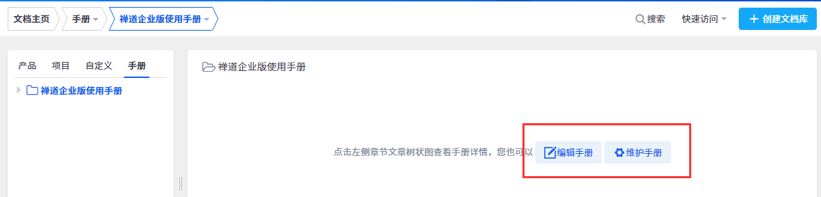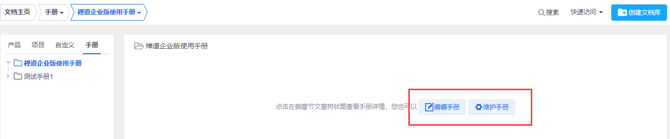 禅道企业版自2.3版本后,文档模块新增手册类型文档。