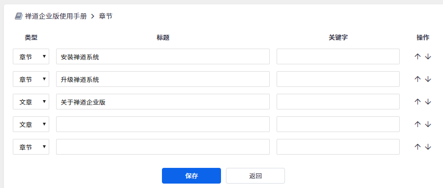 手册目录类型分为章节和文章,且顺序可以自由调控。