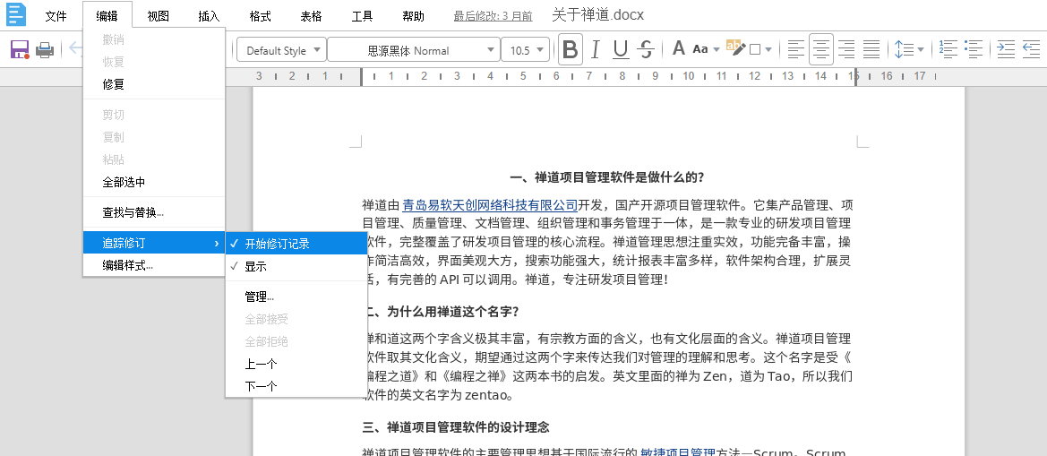 勾选 开始修订记录,编辑文档时,会记录当前禅道登录用户的编辑信息。