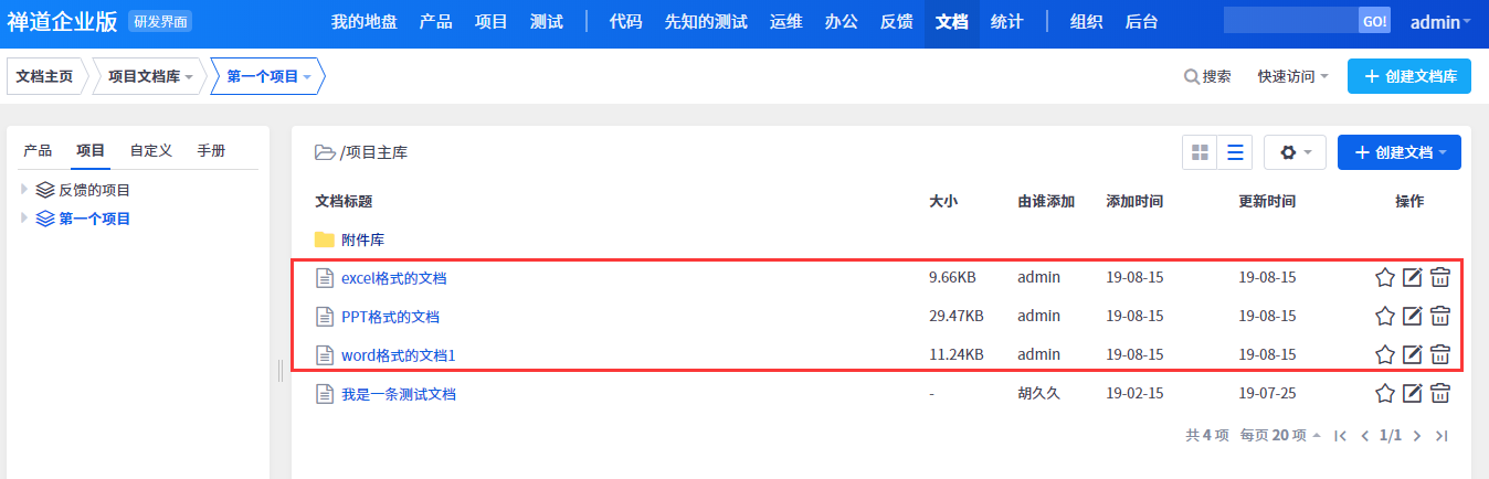 禅道企业版3.2版本,文档新增加了直接创建Word、PPT、Excel格式的功能。