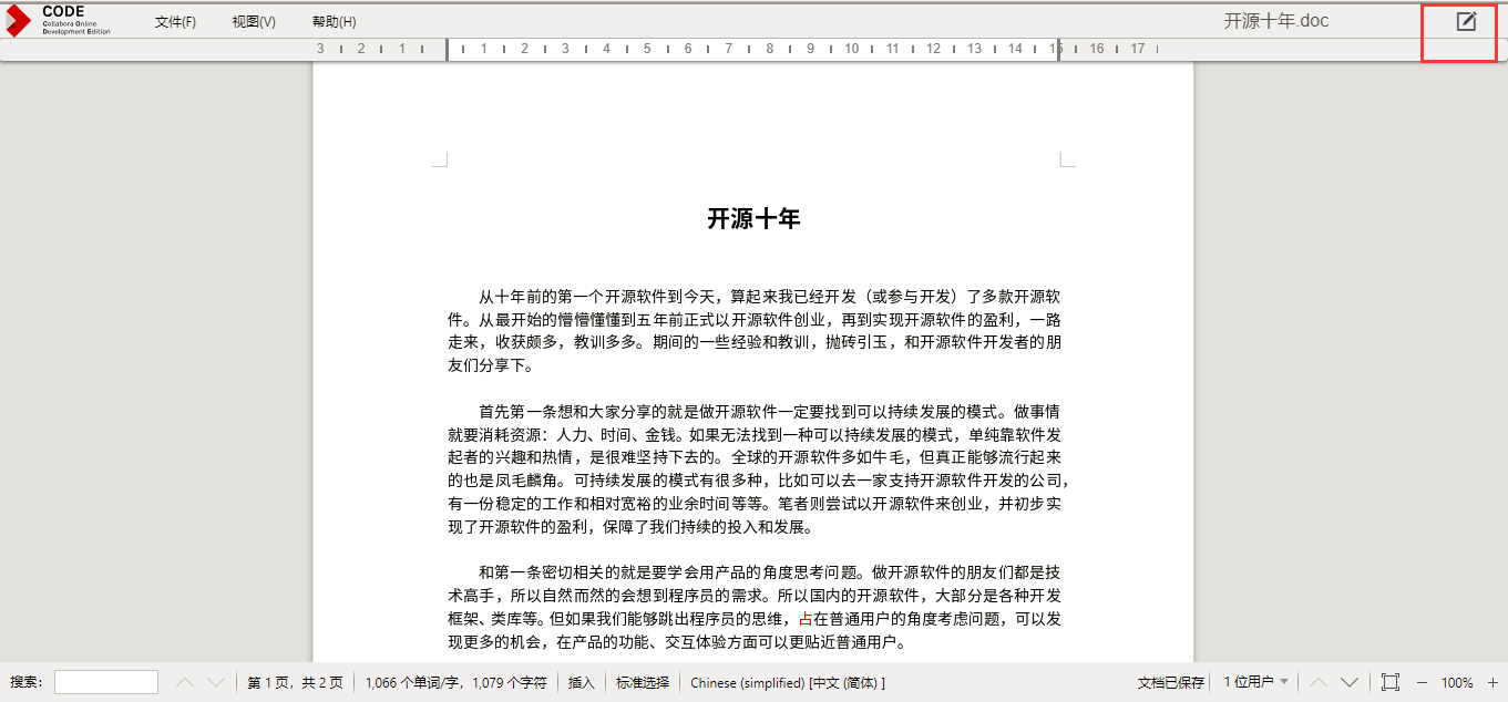 下面以word文档为例,介绍collabora office的在线预览和编辑。