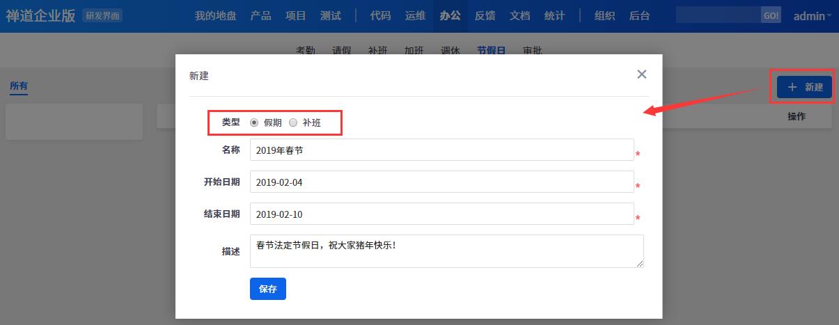在节假日页面右上角有 新建 按钮。