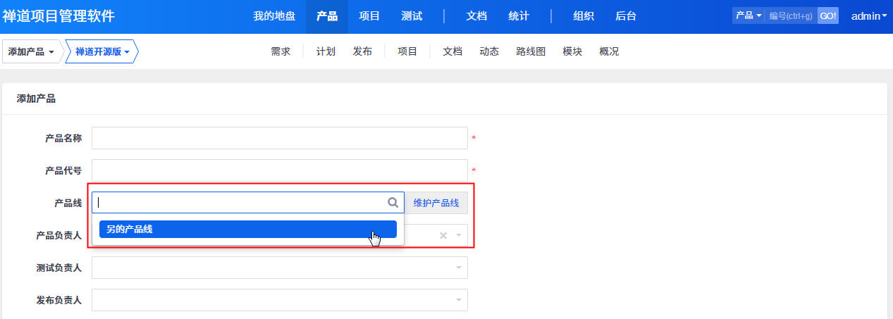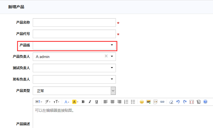 添加新产品时,可以选择所属的产品线。