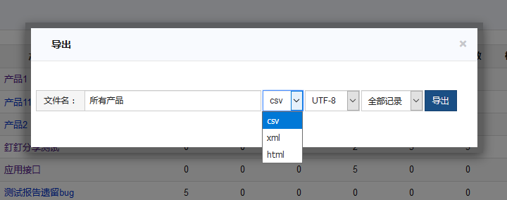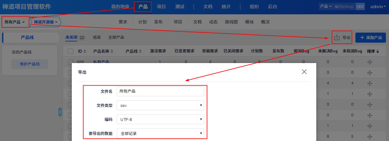 同样是点击 所有产品,进入所有产品的列表页,点击右上角的 导出 按钮即可导出所有产品。