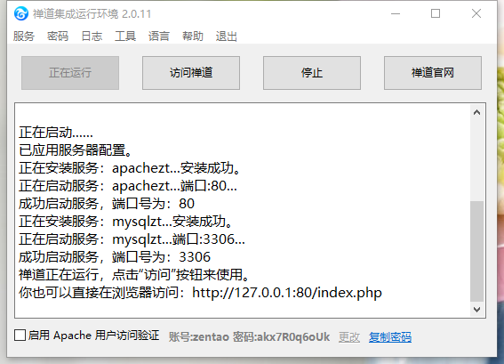 禅道windows一键安装包,Apache用户访问验证默认是开启的,记得一定要手动关闭,不勾选即可。