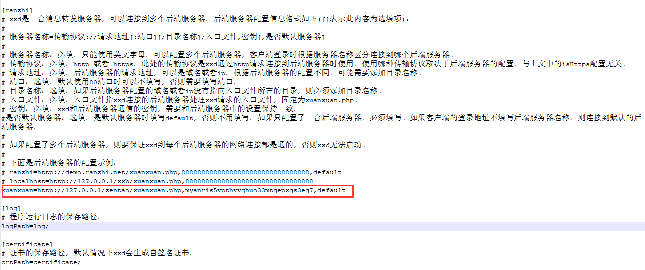那么我的实际配置为:xuanxuan=http:127.0.0.1/zentao/xuanxuan.php,myanris5vpthvvghuo33mtqepxqs3eq7,default