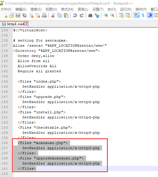 在 xampp/runner/res/apache/conf/httpd.conf文件中setting for zentaopms和setting for zentaopro里加上以下代码。