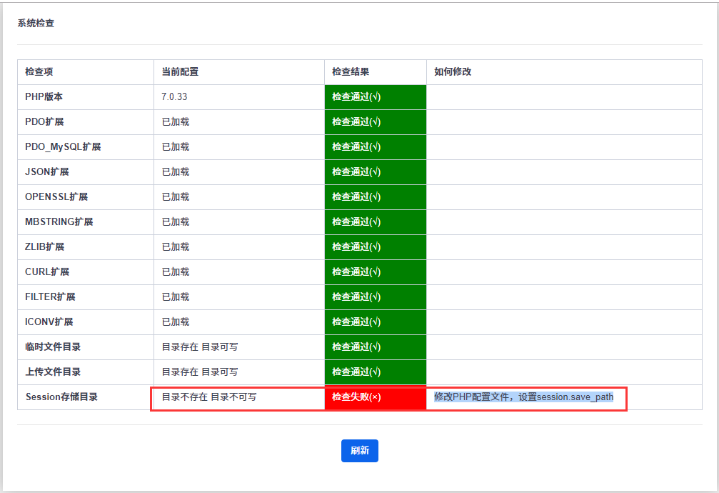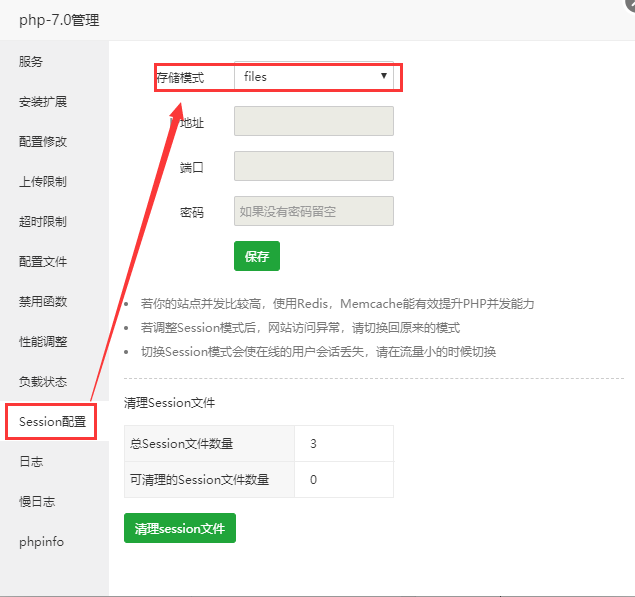 (1)如果遇到如上图一样的报错,找到session配置页面,检查下储存模式是否是files,如果不是修改为files。(宝塔的新版本增加了这个功能,老版本没有这个功能的话,可以不用设置)。