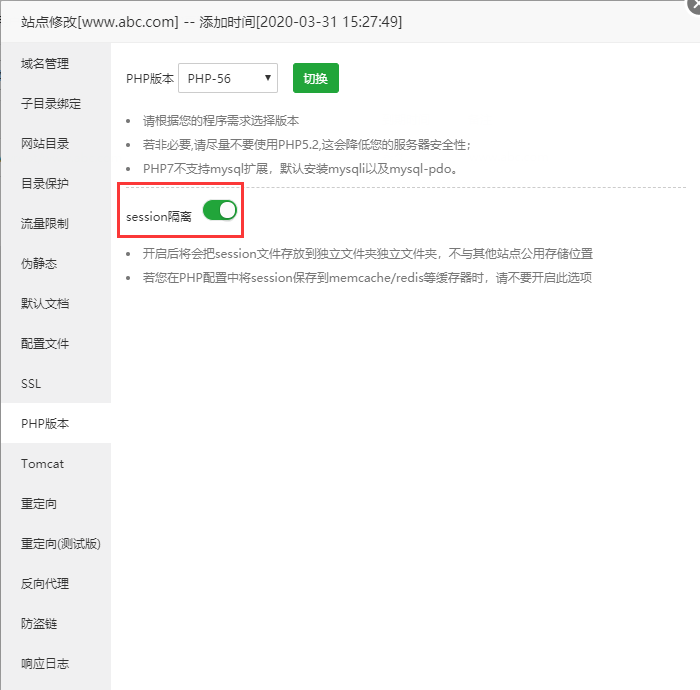 (3)修改网站-设置中PHP版本,session隔离选项为打开。