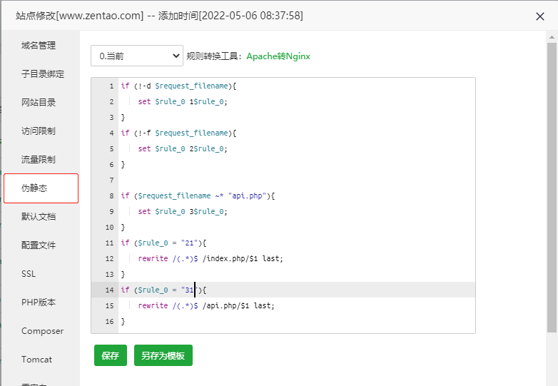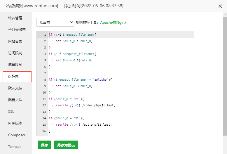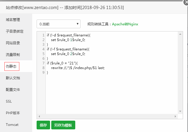 fastcgi_param PATH_INFO $path_info;3.伪静态设置 【设置后禅道手机APP才能访问】