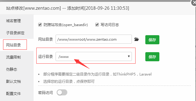 在宝塔面板的网站管理中,点击相应站点的设置按钮,在网站目录中设置运行目录。将运行目录指向/www目录,如下图: