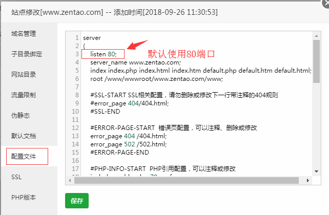 }注:默认是80端口,如果需要修改其他端口,需要在配置里修改 listen 端口号。