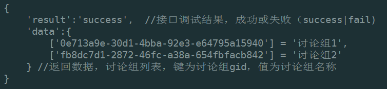 | data | 对象 | 该对象定义了系统中的讨论组清单,对象属性名为讨论组的全局唯一 标识字符串(GID),属性对应的值为讨论组名称 |