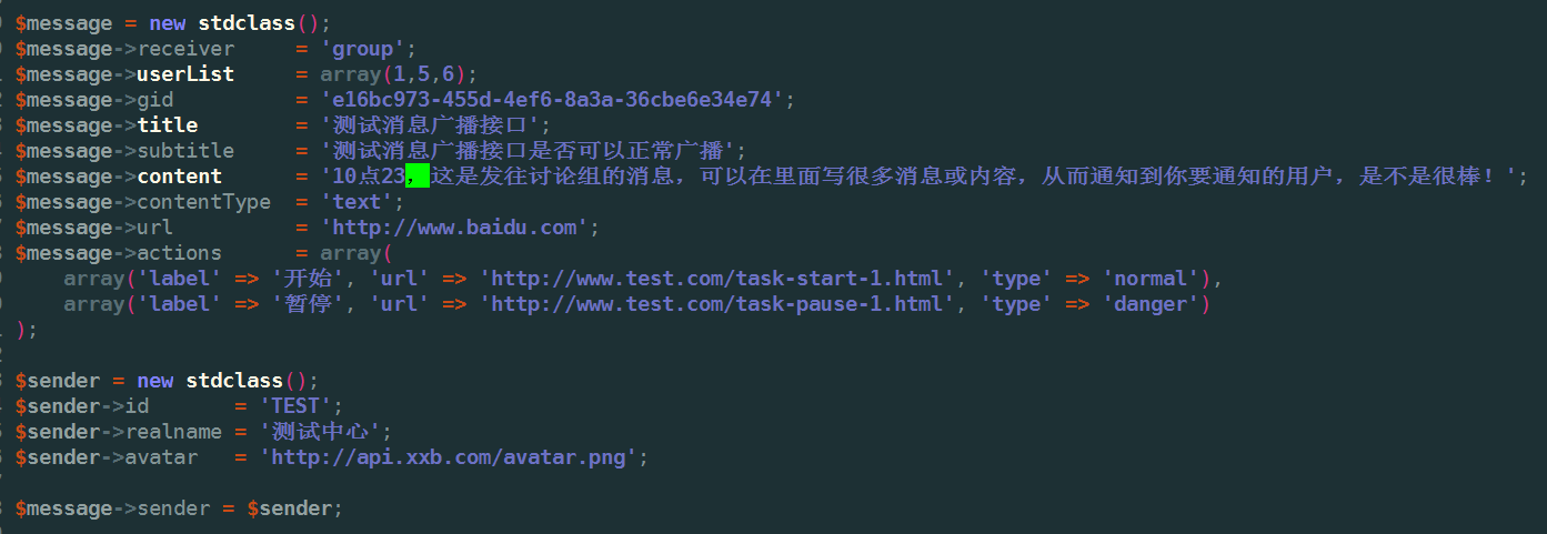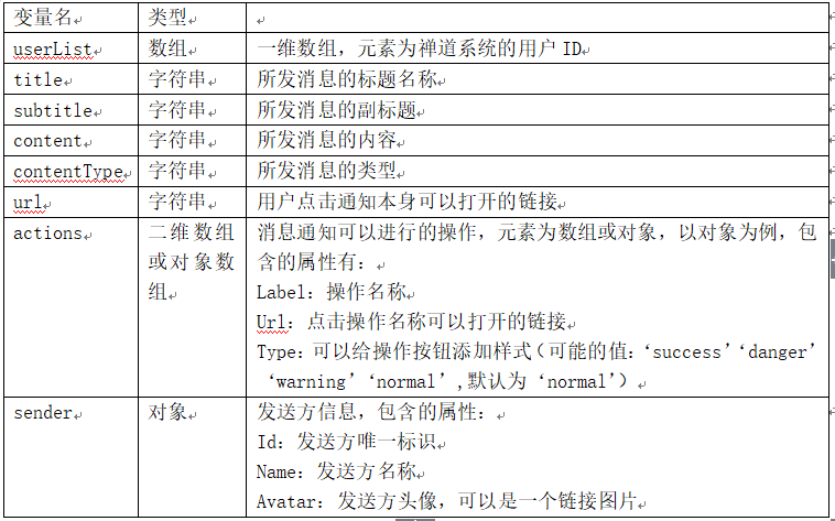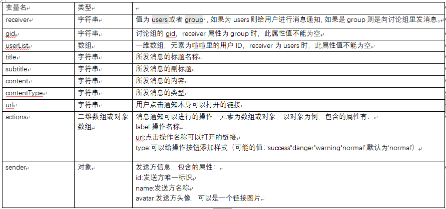 | gid | 字符串 | 特定条件必须 | 为讨论组的全局唯一字符串,指定通知发送到的讨论组,当向讨论组发送通知时必须(即receiver为'group') |