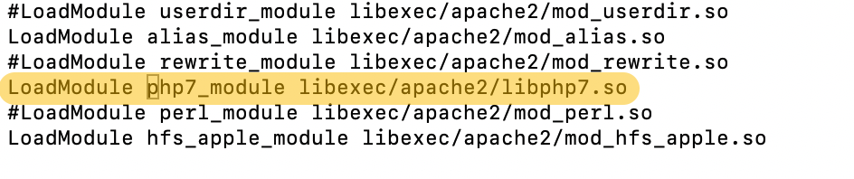 整合Apache与PHP,打开Apache配置文件 httpd.conf,搜索“php”找到 # LoadModule php7_module libexec/apache2/libphp7.so 去掉注释符号#。