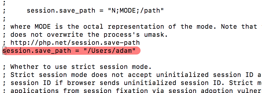 修改PHP配置文件,该配置文件默认位于 /etc/php.ini.default备份 php.ini.default 文件后将 php.ini.default 重命名为 php.ini ,并在文件内搜索 session.save_path = "/tmp" ,修改此 "/tmp" 值,建议修改路径为 /Users/zentao (路径可自定义到任意真实存在路径下),如下图所示。修改完成后,将此项的注释放开,即删除 ";" 符号,执行如下命令,给予文件权限。