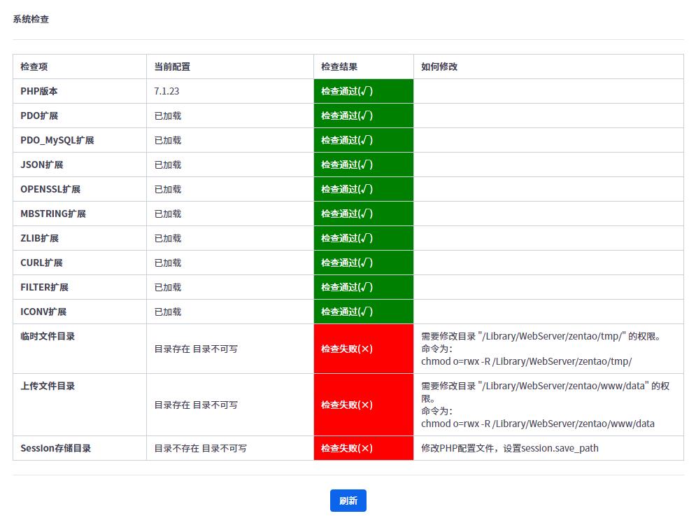 禅道运行需要pdo, pdo_mysql, json, filter, openssl, mbstring, zlib, curl, gd, iconv这几个模块,请确保PHP环境中都有加载。