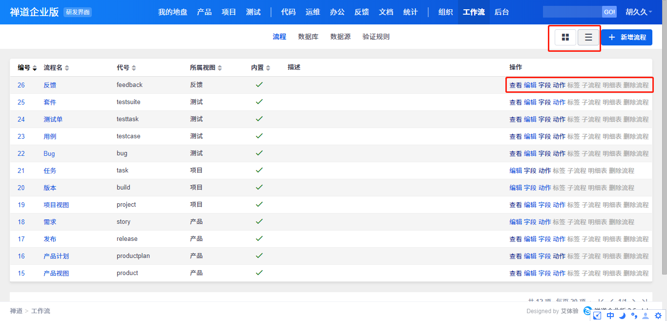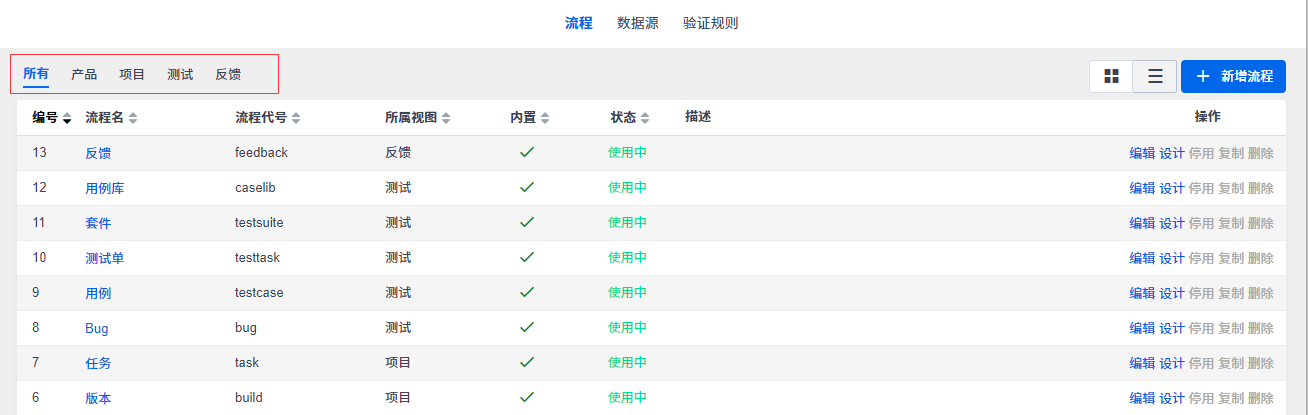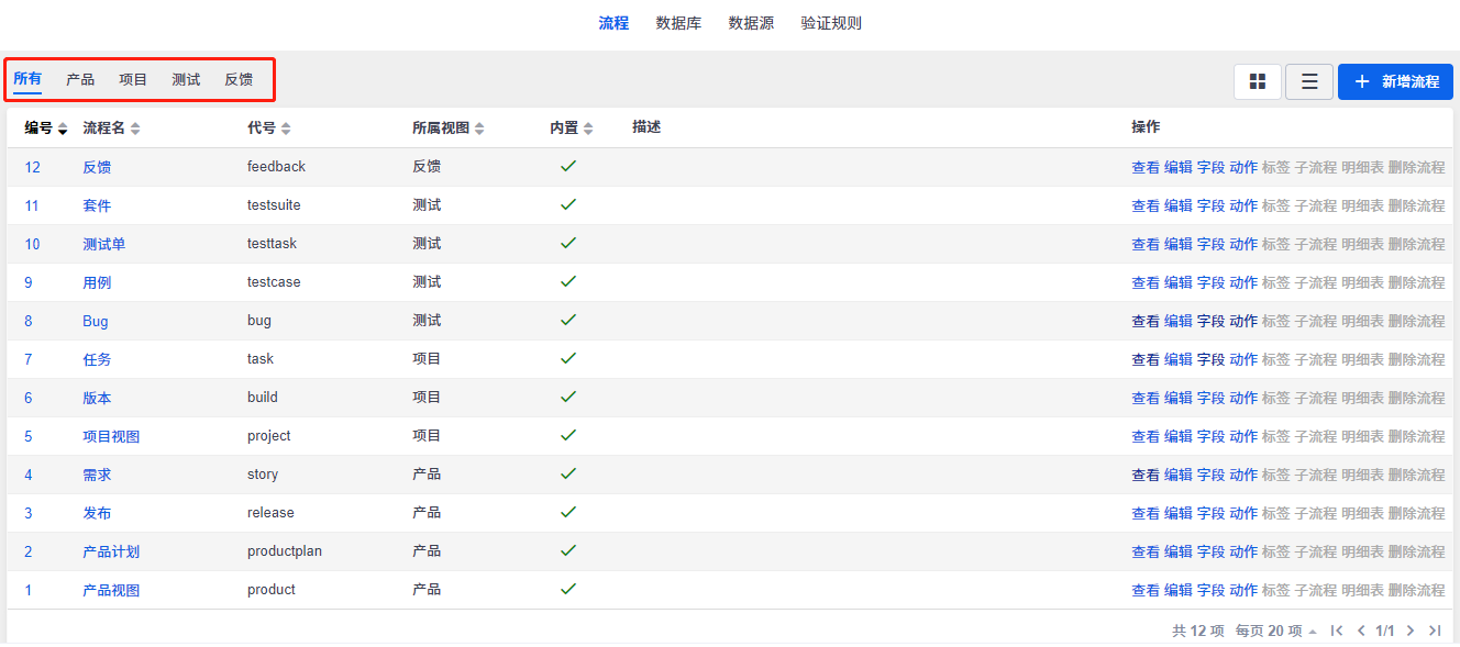 工作流目前根据禅道使用流程、功能模块以及自定义需要,目前内置了产品视图、产品计划、发布、需求、项目视图、版本、任务、Bug、用例、测试单、套件、用例库、反馈这13个流程。