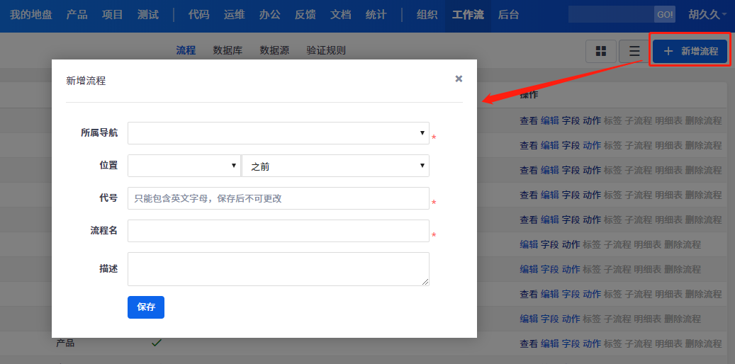 点击工作流---流程页面右上角的“新增流程”按钮,就可以添加新的工作流了。工作流发布后,该工作流会显示在对应的所属导航的菜单上。