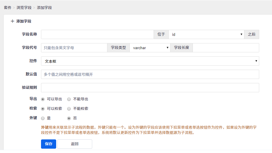 - 键值:外键用来关联显示子流程的数据,外键只能有一个。设为外键的字段应该使用下拉菜单或者单选按钮作为控件,如果设为外键的字段控件不是下拉菜单或者单选按钮,系统将默认更新控件为下拉菜单并选择数据源为子流程。