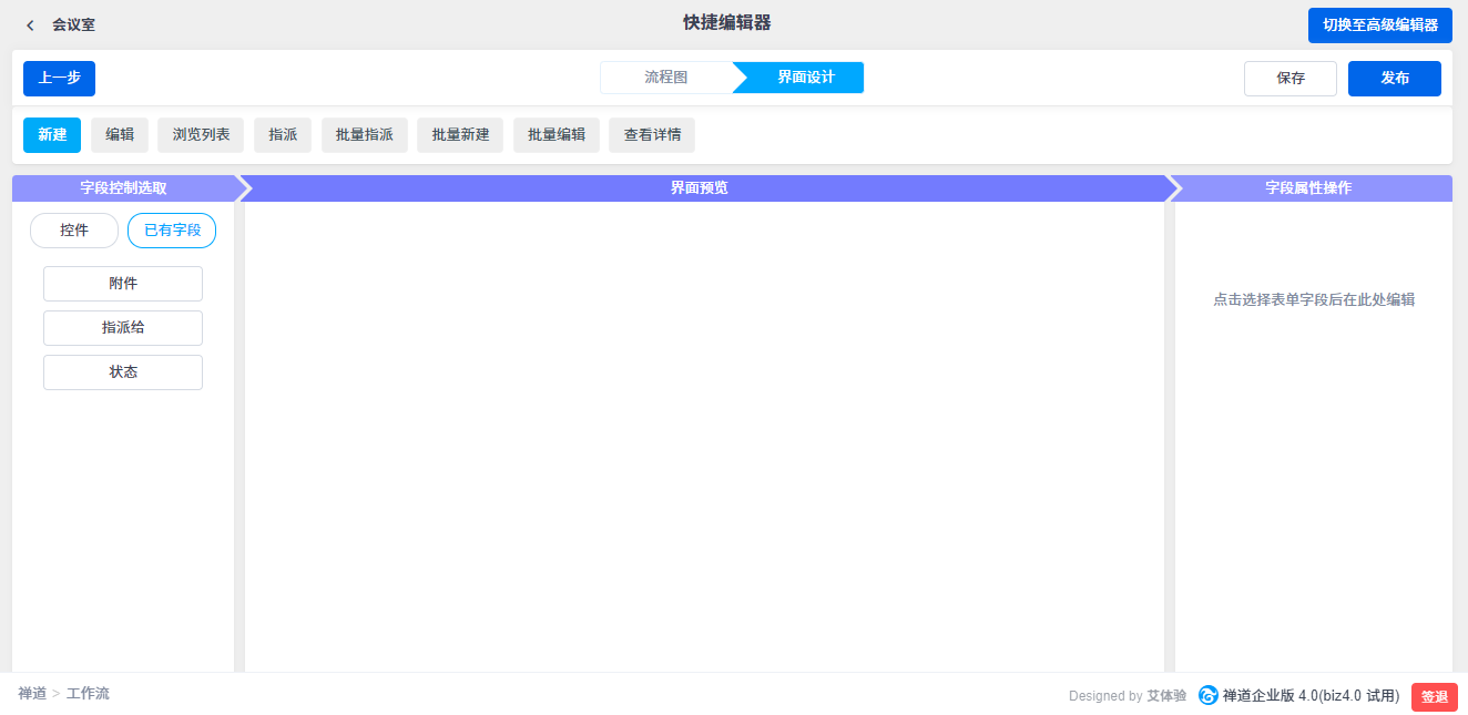 快捷编辑器模式下,可以通过拖拽、移动、编辑等方式,快速选取所需字段控件,对相关页面进行设计。从左侧选择所需拖动到界面预览处,选中后,可以通过右侧的属性操作区,进行细节编辑。