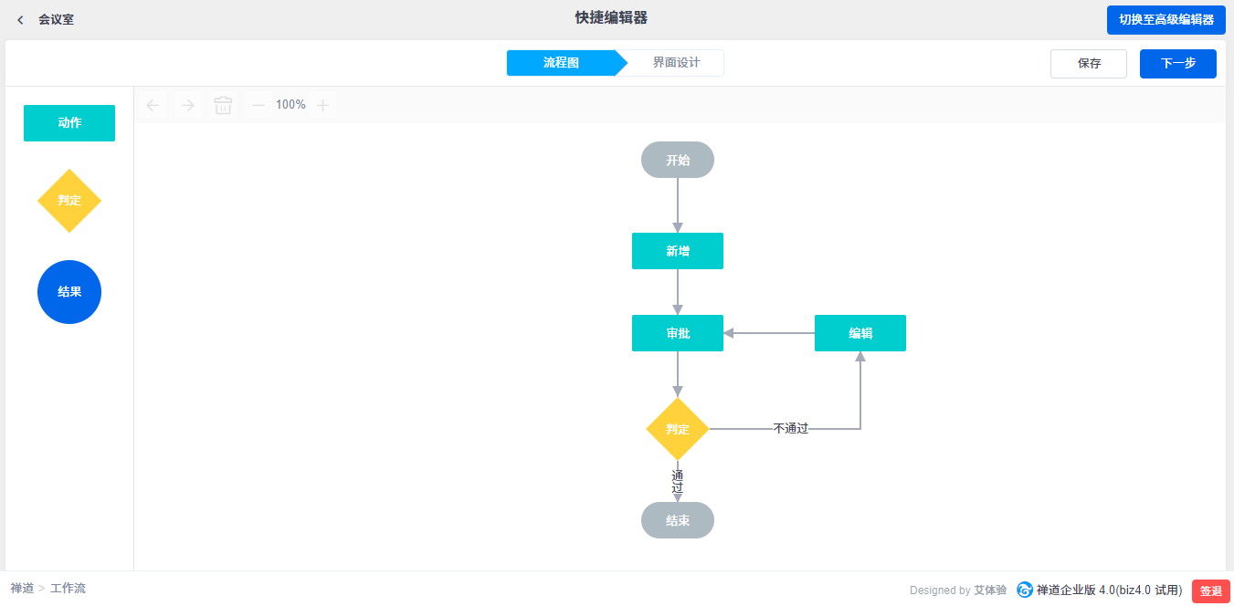 通过快捷编辑器模式下的流程图设计,可以快速将复杂的流程可视化,对整个流程的逻辑、内容有一个整体全面的了解,以此为基准,进行下一步的界面设计,使整个流程清晰可控。