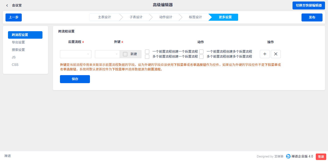 高级编辑器模式下可以对流程进行更丰富、更多细节的设计,如主表设计、子表设计、动作设计、标签设计、更多设置等,更多设置下又包含跨流程设置、导出设置、搜索设置、JS、CSS等。