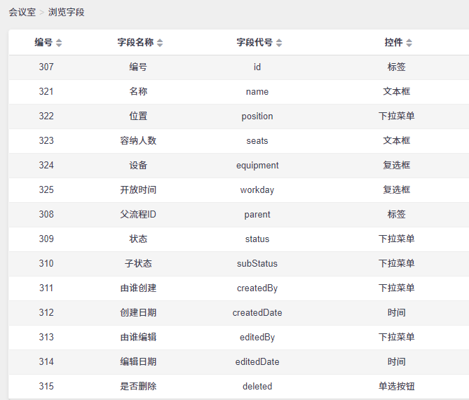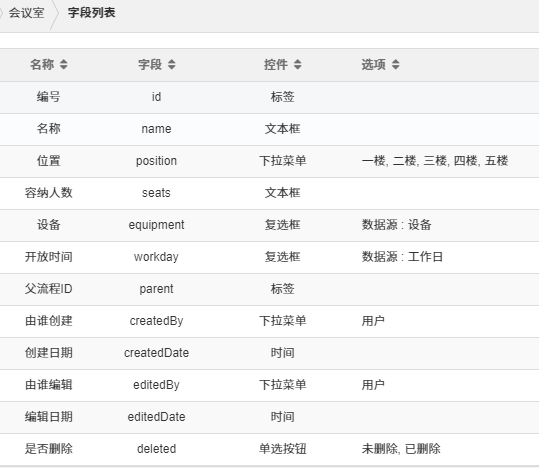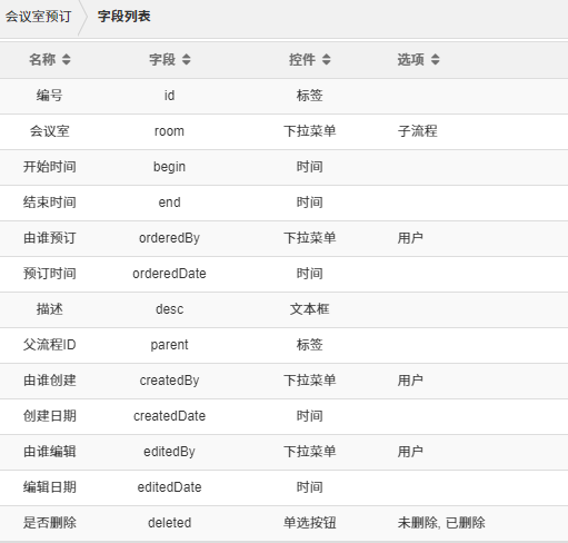 子流程会议室的其他字段,可以根据我们的需求设计,按照以下列表所列的字段一一添加即可。