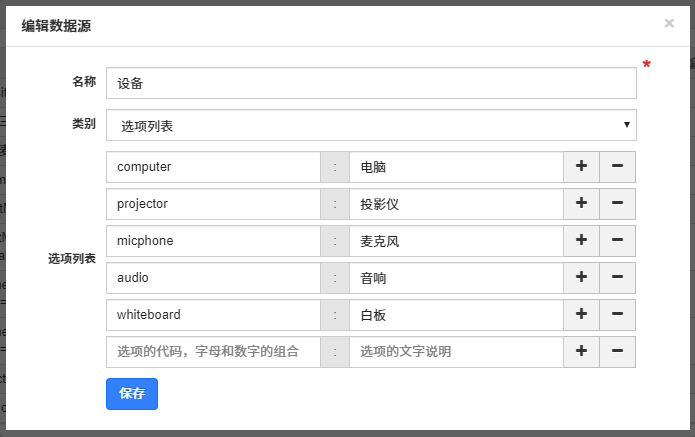 在这里我们需要创建子流程会议室的数据源:设备、工作日。