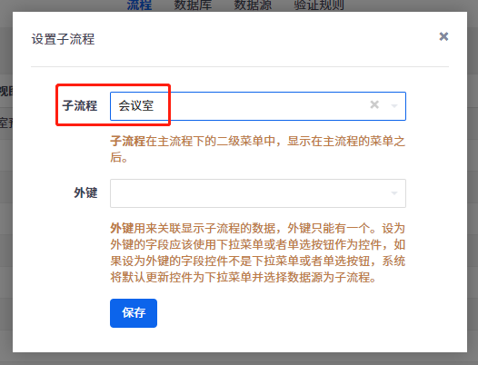 如果设为外键的字段控件不是下拉菜单或者单选按钮,系统将默认更新控件为下拉菜单并选择数据源为前置流程。