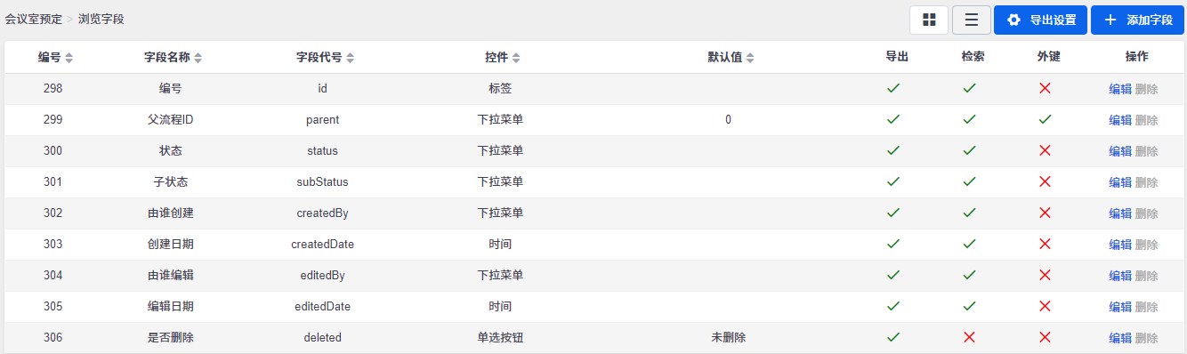 点击“会议室预定”流程右侧的“字段”按钮,进入字段列表页面,点击字段列表页面右上角的“添加字段”按钮,进入字段添加页面。