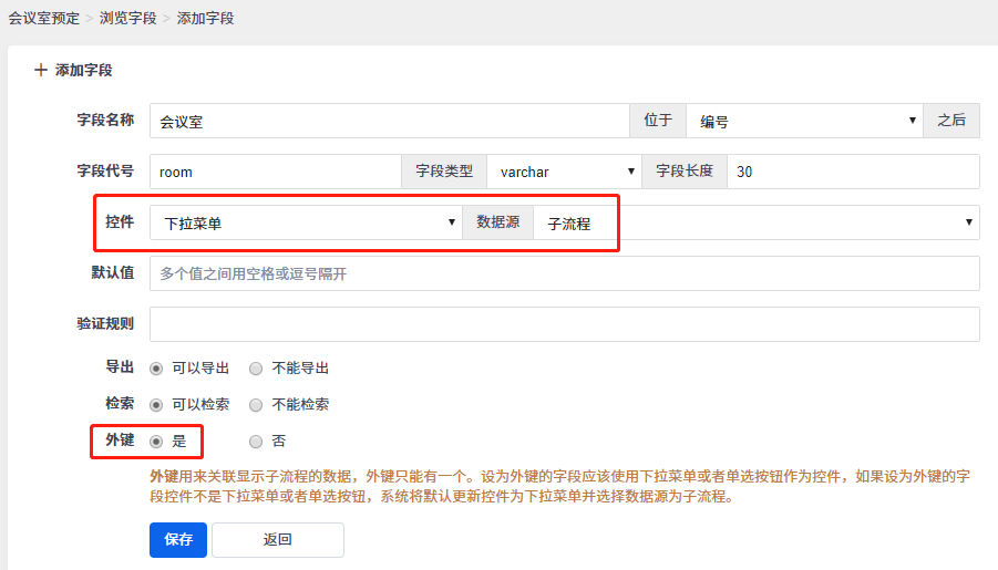 例如会议室流程设置会议室预订为后置流程,外键为会议室,那么会议室预定这个流程里,会议室这个字段应该使用下拉菜单或者单选按钮为控件。