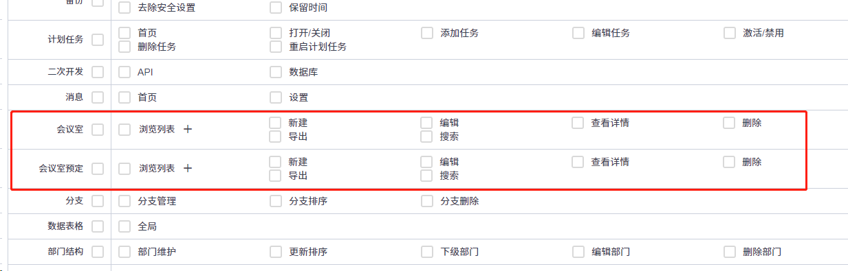 我们添加完预定会议室和会议室的标签和动作后,在组织--权限里,会默认加上对应权限。