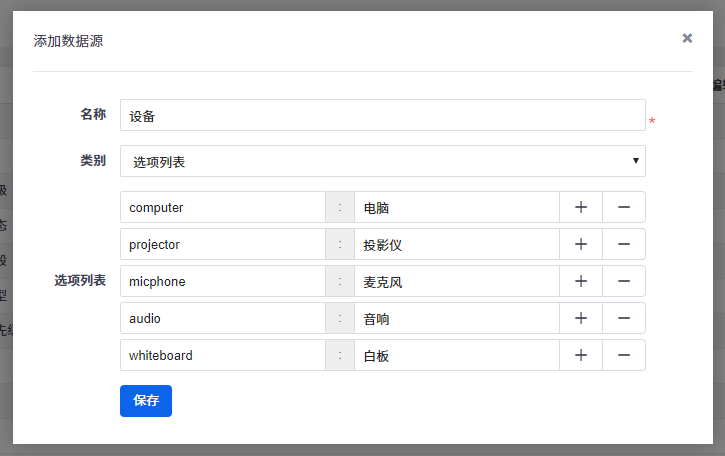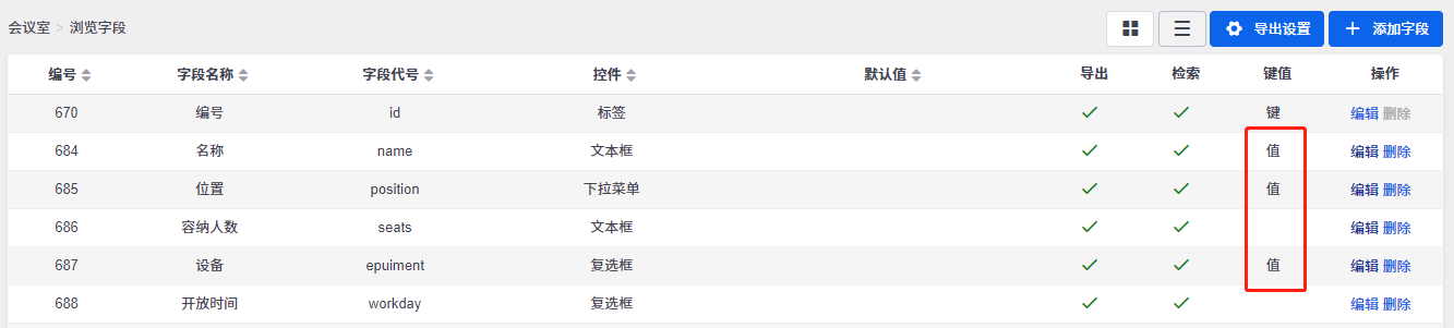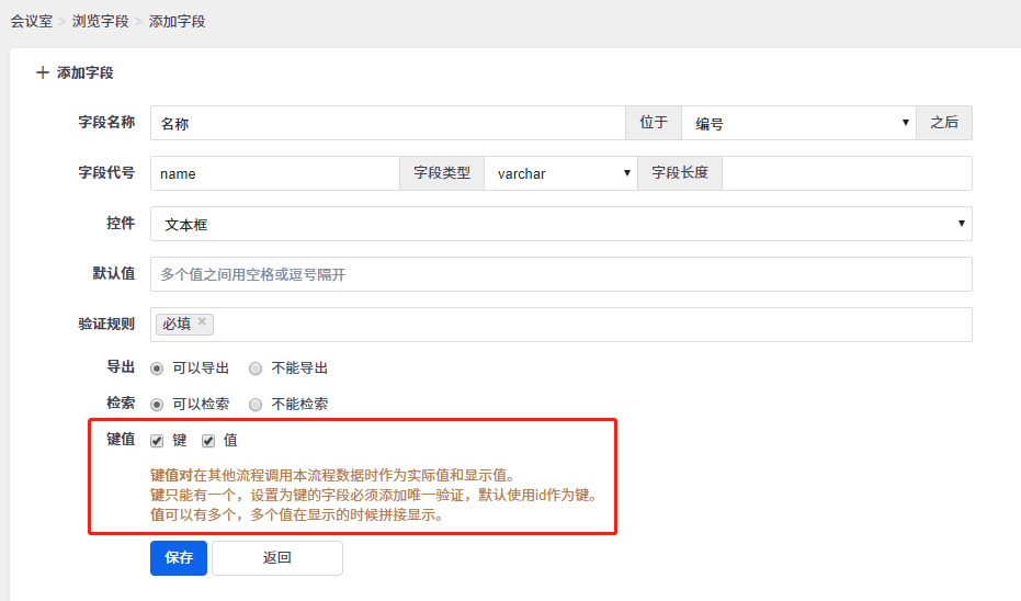 会议室这个流程中,我们把会议室的名称、位置、设备的键值都设置为了值。