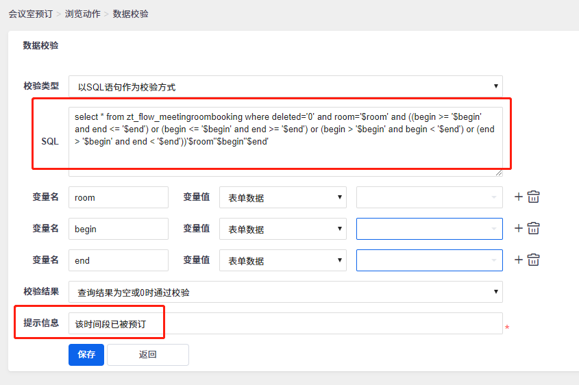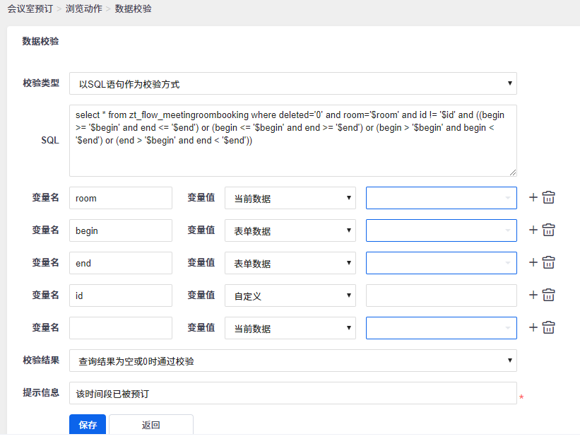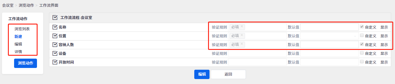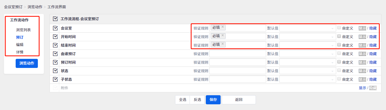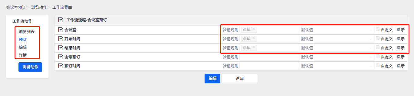 以会议室预订为例,我们需要设置动作的数据校验、设置提醒。