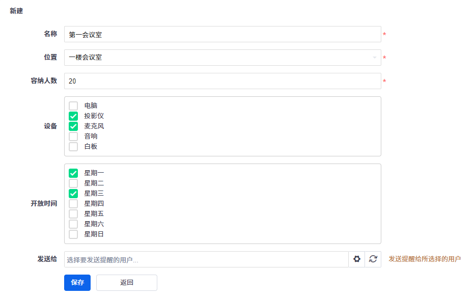 以下就是我们设置会议室的新建页面,填写好信息保存即可。