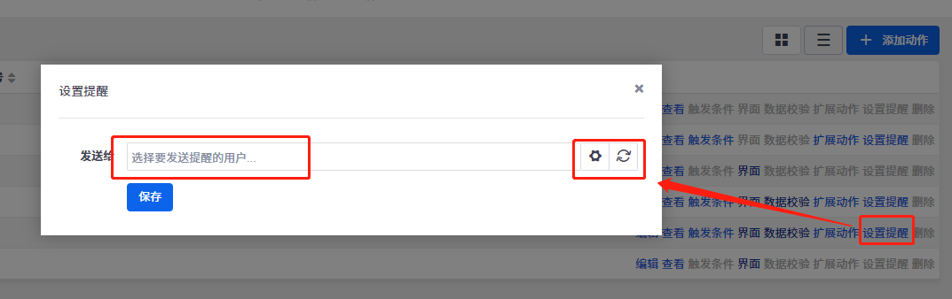 添加动作和动作界面设置完成后,我们接下来要检查一下是否需要设置动作数据校验、是否要添加扩展动作、是否需要设置提醒。