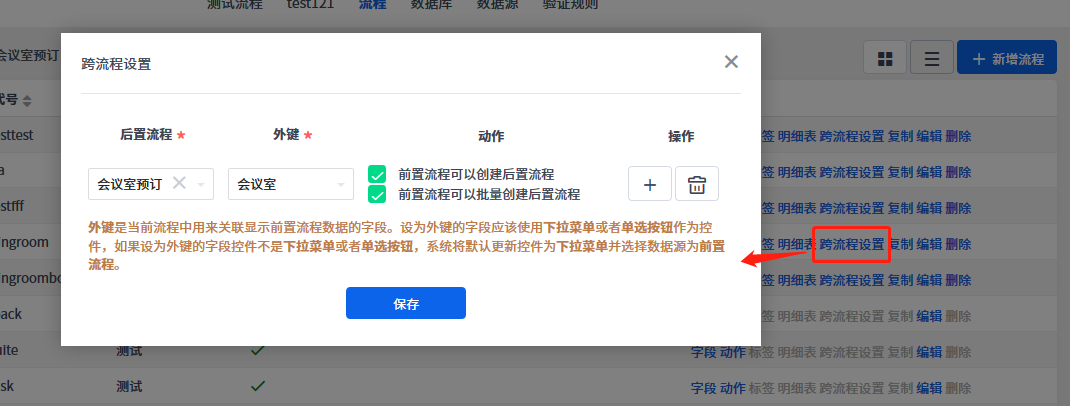点击流程列表的‘跨流程设置’按钮,就可以跳转到跨流程设置页面。